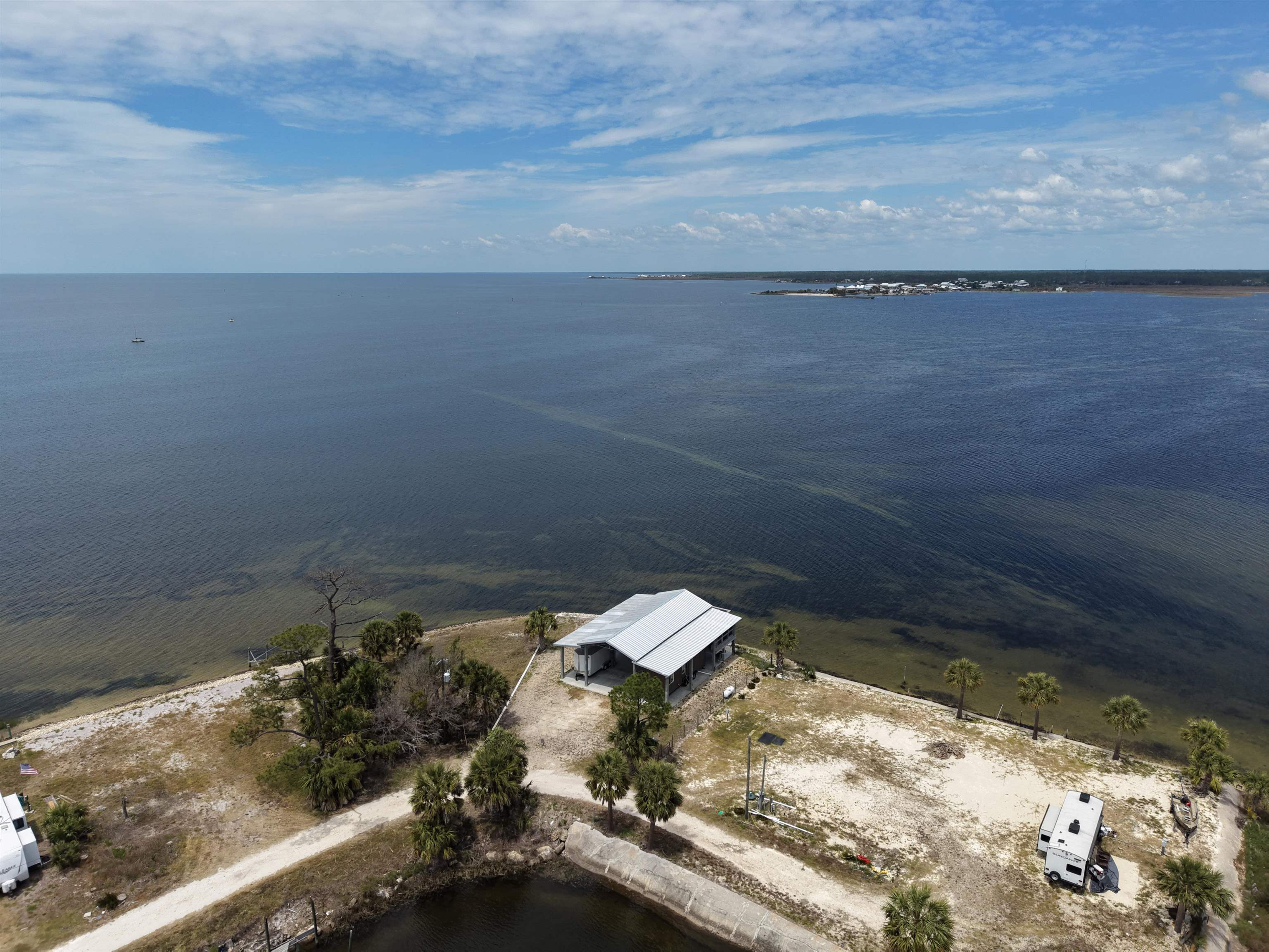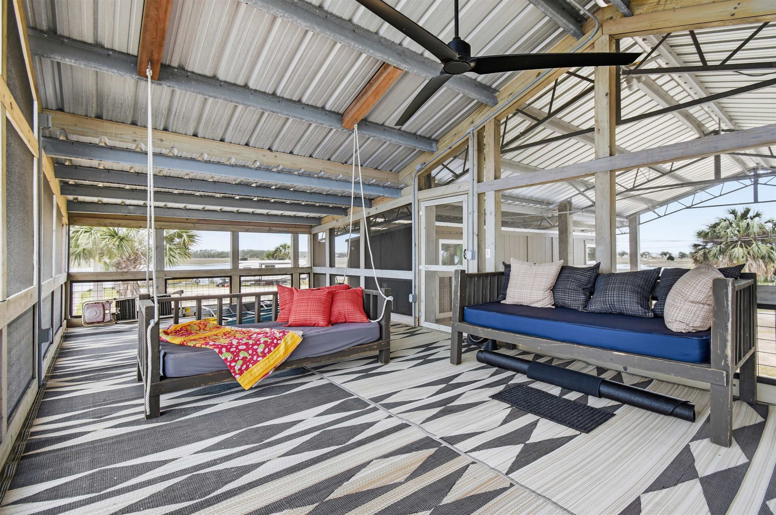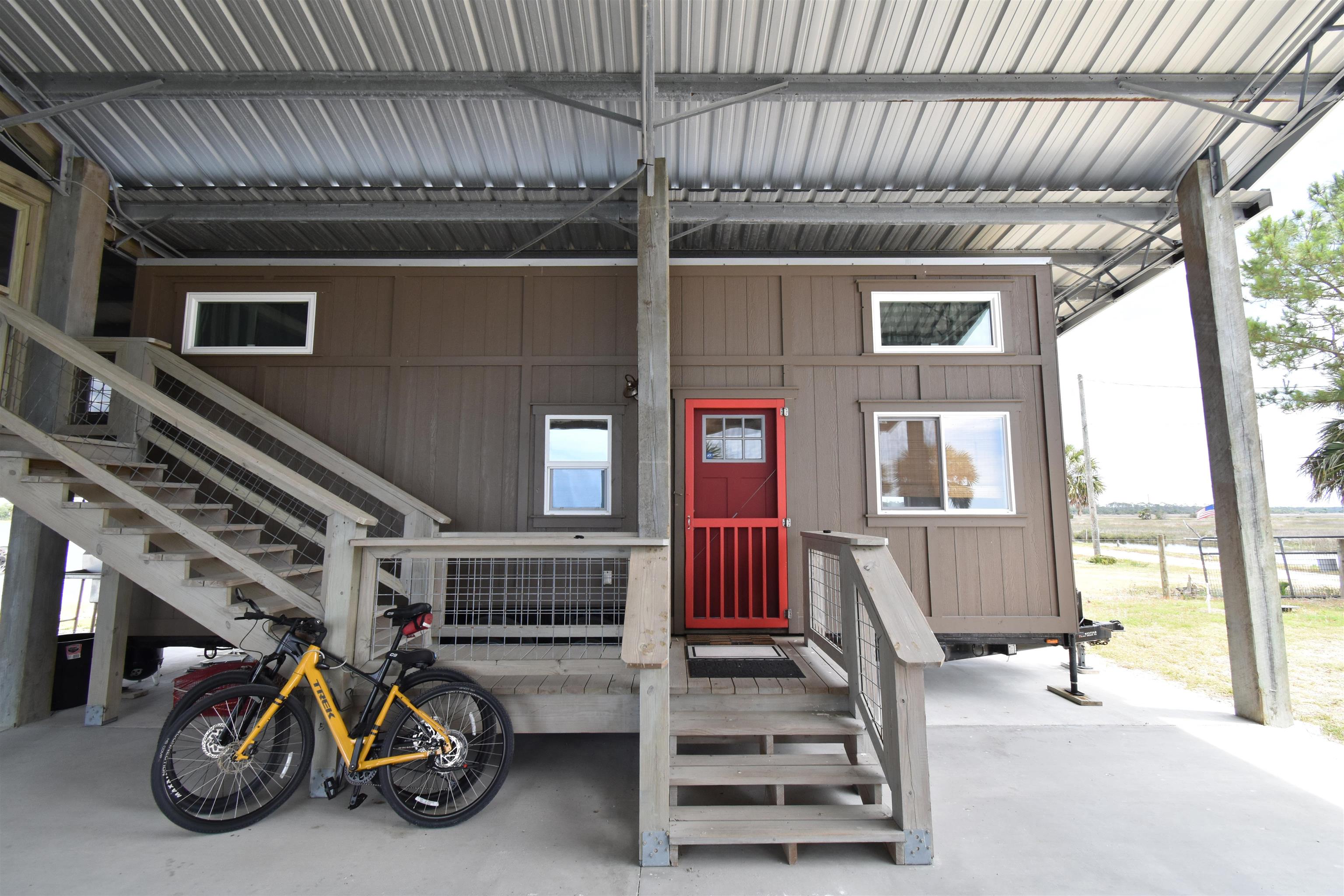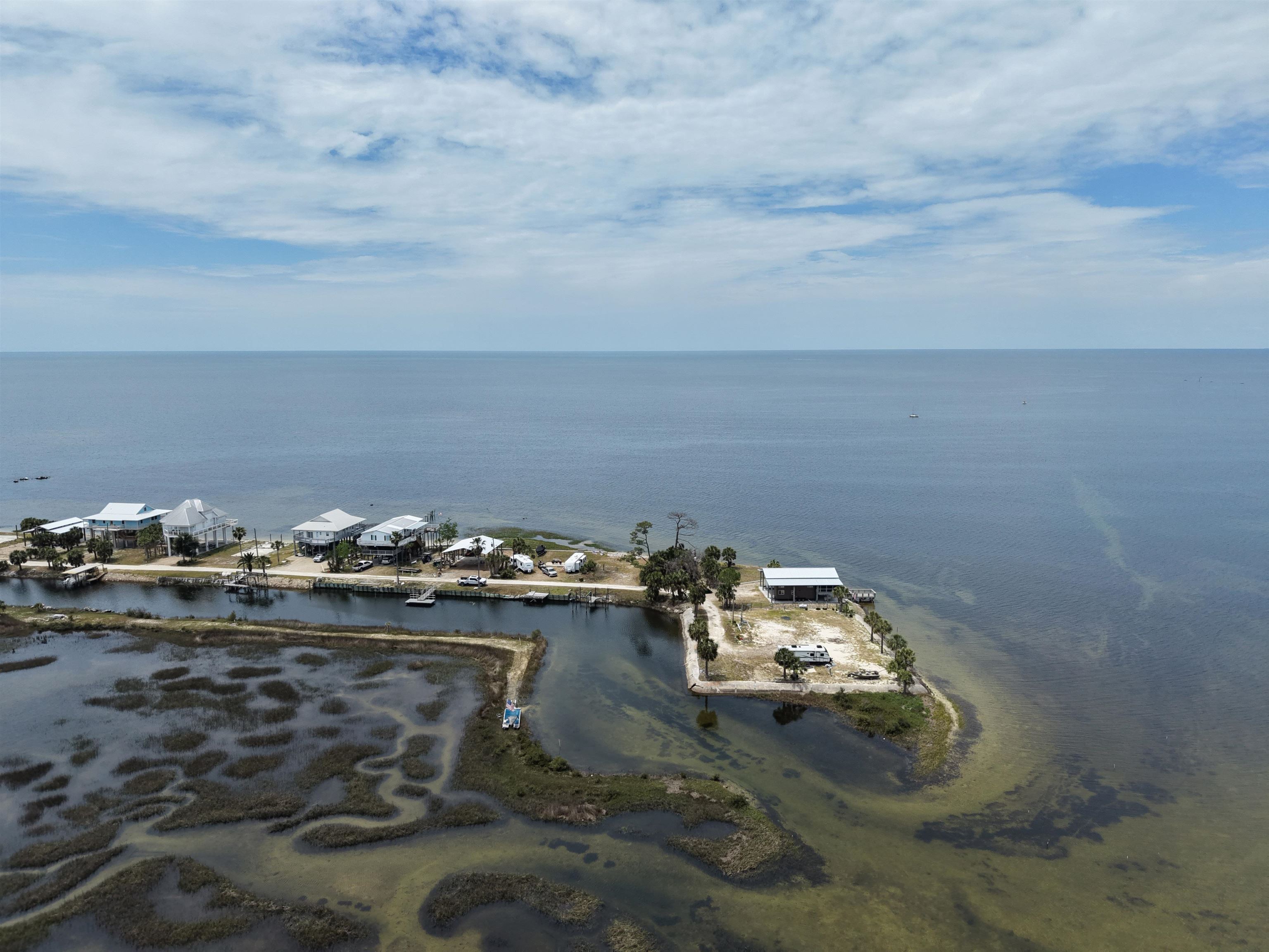 Rare opportunity to own a 0.18-acre waterfront lot in the highly desirable Dark Island, FL community with canal access. This property is fully equipped and ready for immediate use or future development. Features include a state-of-the-art pole barn, ideal for storage and versatility, along with a custom dock suitable for flats boats and airboats with convenient canal and waterfront access. Enjoy outdoor living with multi-level decks integrated into the pole barn, designed for entertaining and relaxation. The property also includes a fully furnished loft-style 2-bedroom, 1-bath tiny home, perfect for a weekend retreat, rental income, or full-time living. Utilities are already in place with Taylor Coastal water and sewer connected, along with a 200-amp electrical service. This turnkey waterfront property offers a unique combination of functionality, recreation, and coastal lifestyle.