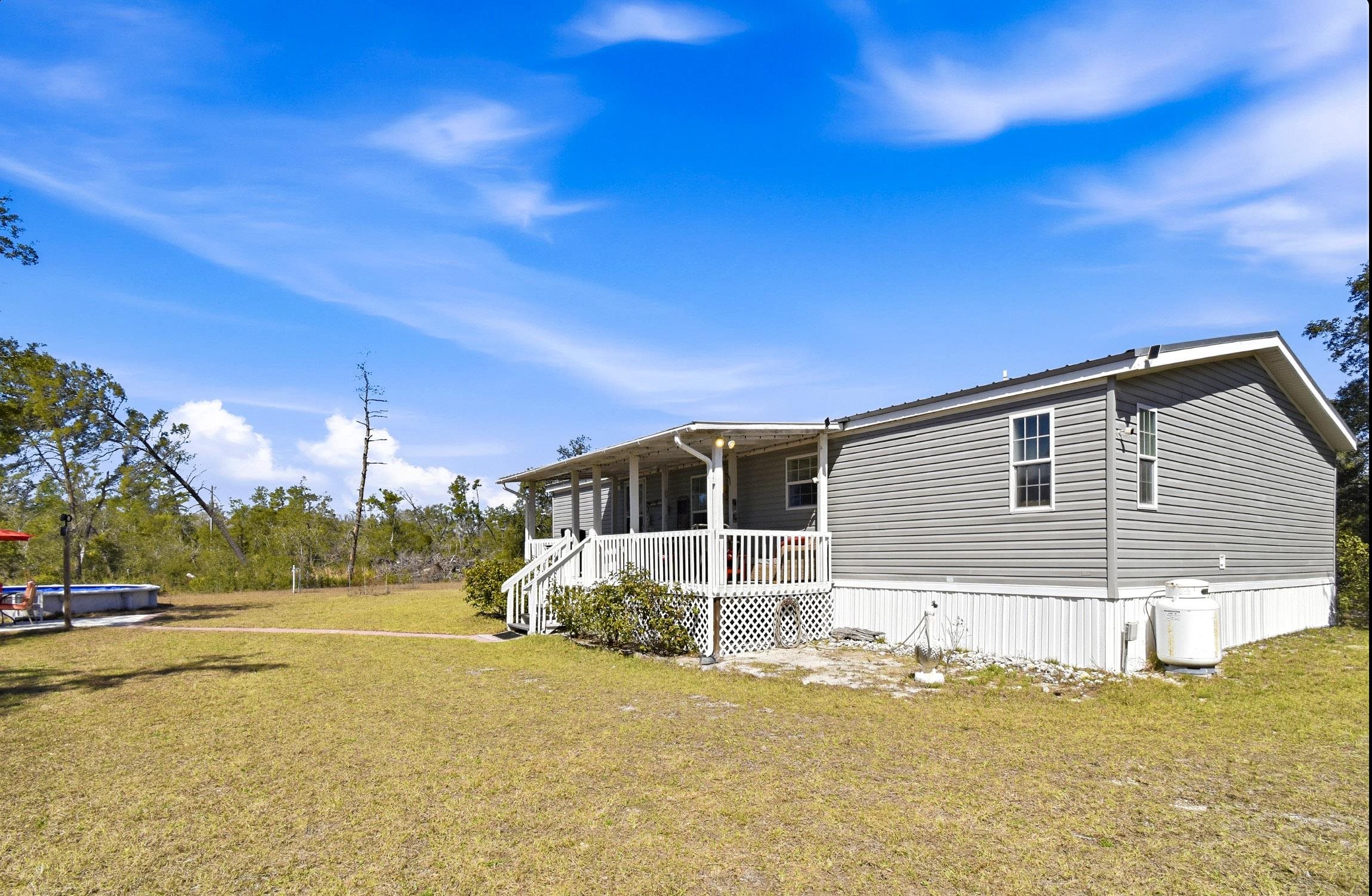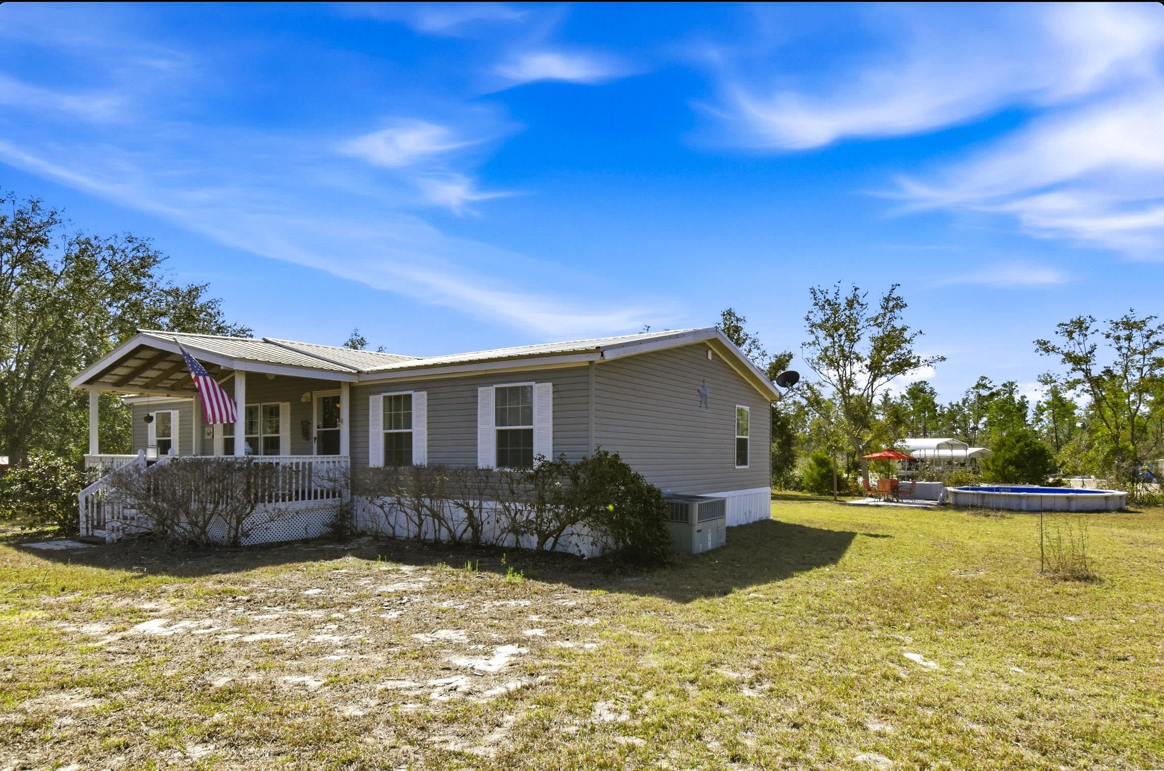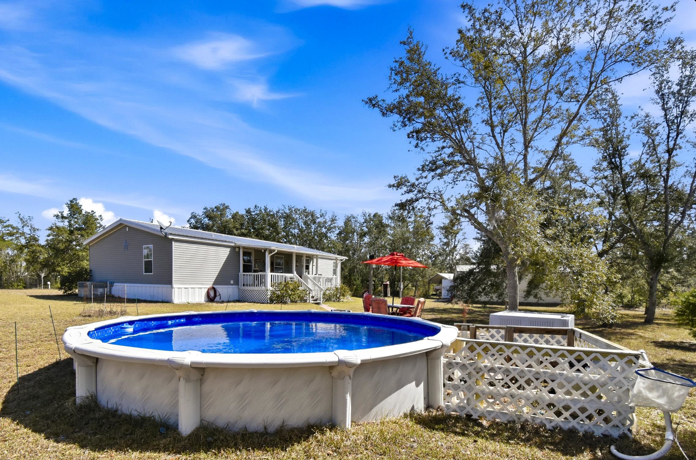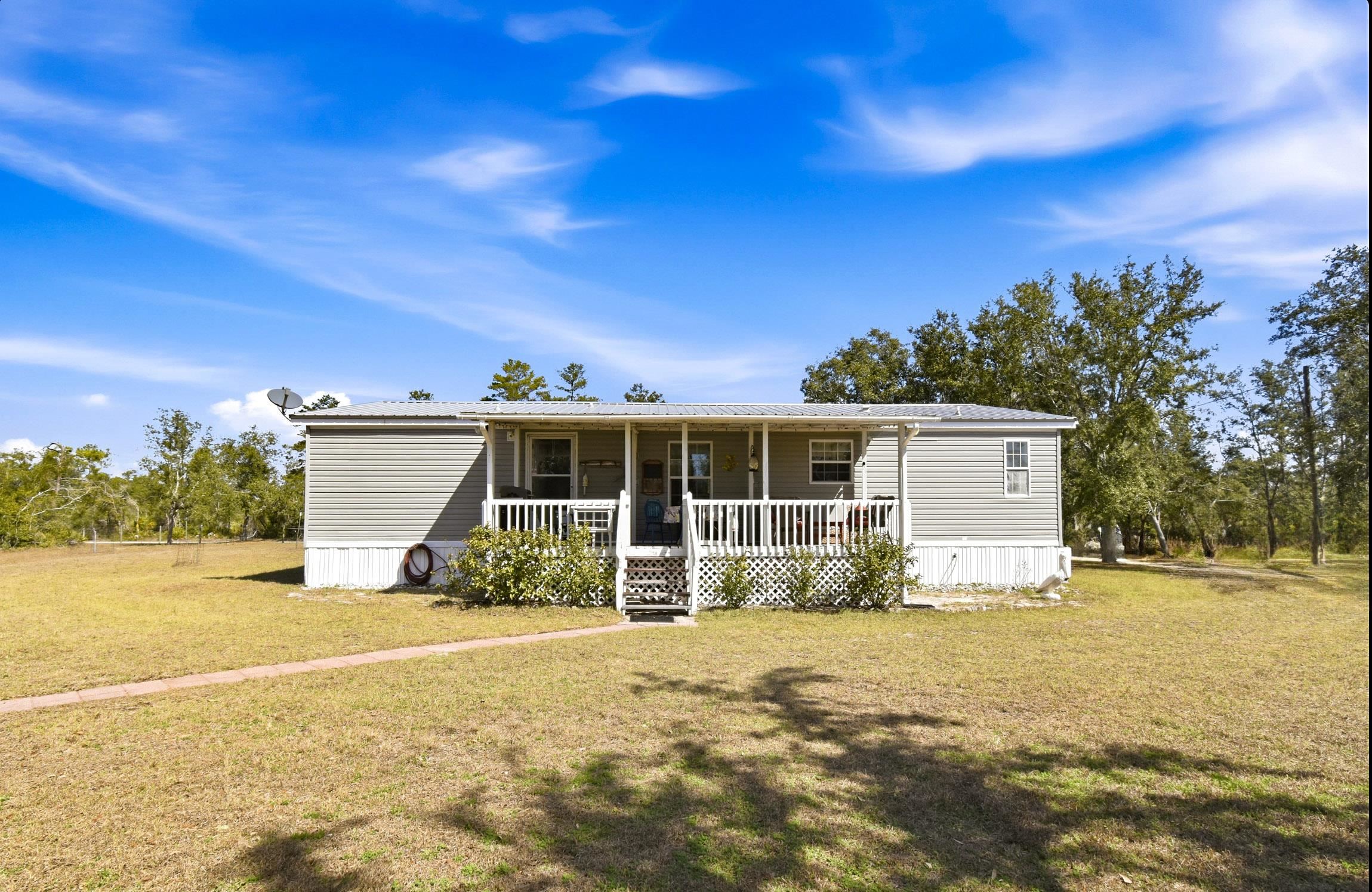 Welcome home to this 4 bedroom, 2 bath split floor plan. The Master is on one side with a soaking tub, double sinks, walk in shower and a walk in closet. There is an oversized shed with electric. Perfect for your ATV or golf cart. Plenty of room for your projects or hobbies. Fish cleaning station on the rear with water. An outdoor oasis awaits you including a pool, relaxing hot tub and paver patio perfect for table and chairs. This home comes partially furnished and would make a fabulous Airbnb or a laid back winter home, no shoveling snow here! Enter through the mud room including washer and dryer plus a water softener. The kitchen has a large expansive island that can serve as the perfect breakfast spot. There are 2 acres of fenced property with remote control gates. Located adjacent to the Wildlife Management Area, take a walk, ride your bike or use the ATV to explore the area. Sip some sweet tea on the fully covered back porch and bird watch, it's amazing. Or rock on the front porch and star gaze. The Gulf is only 5 minutes away. Be on the water in minutes.