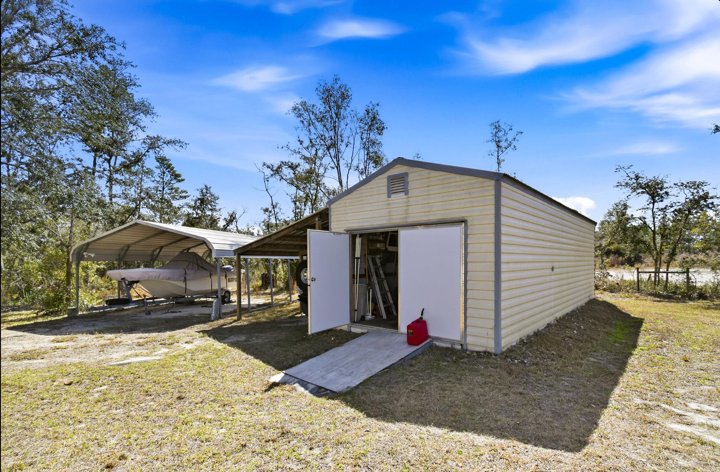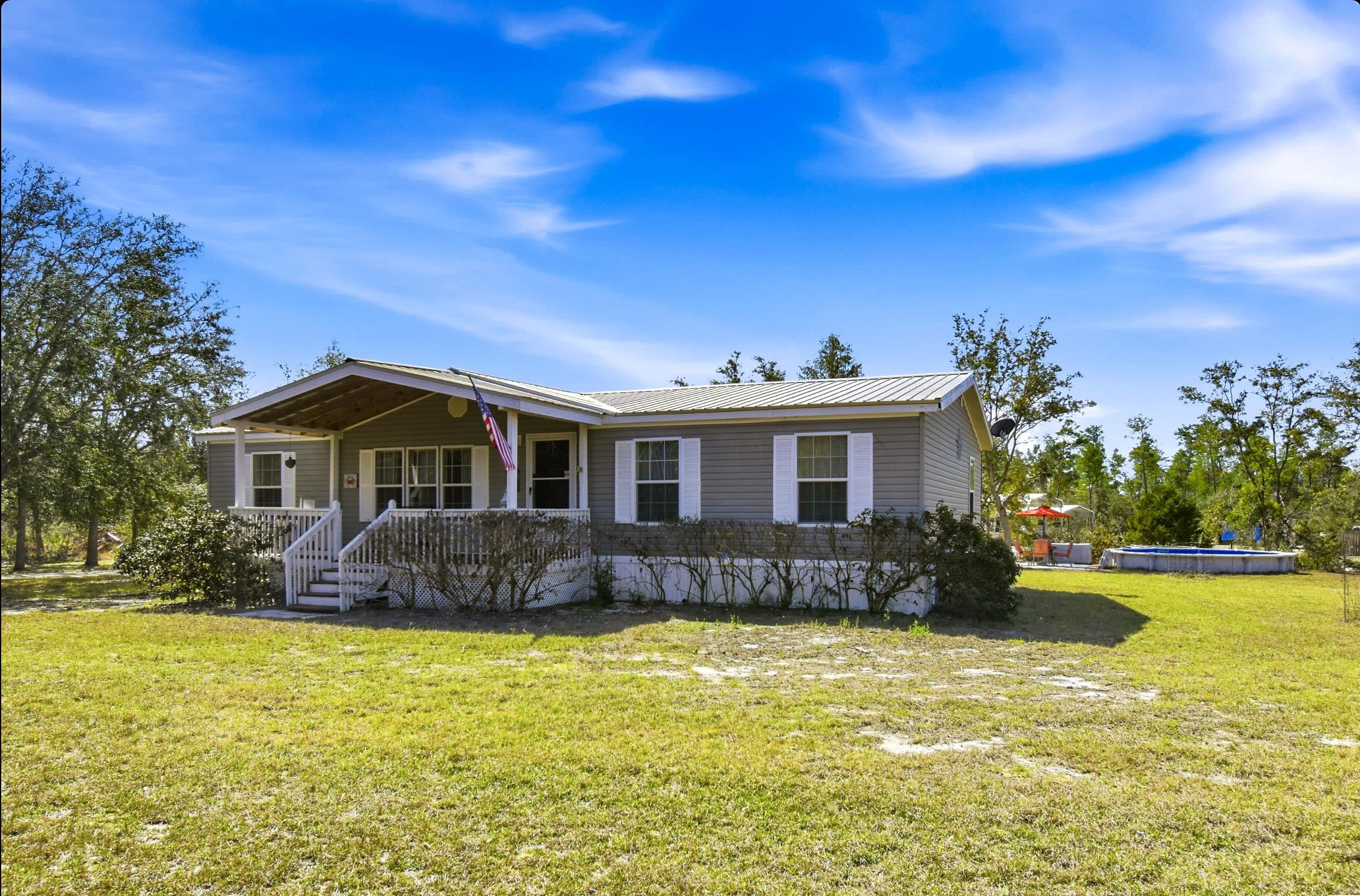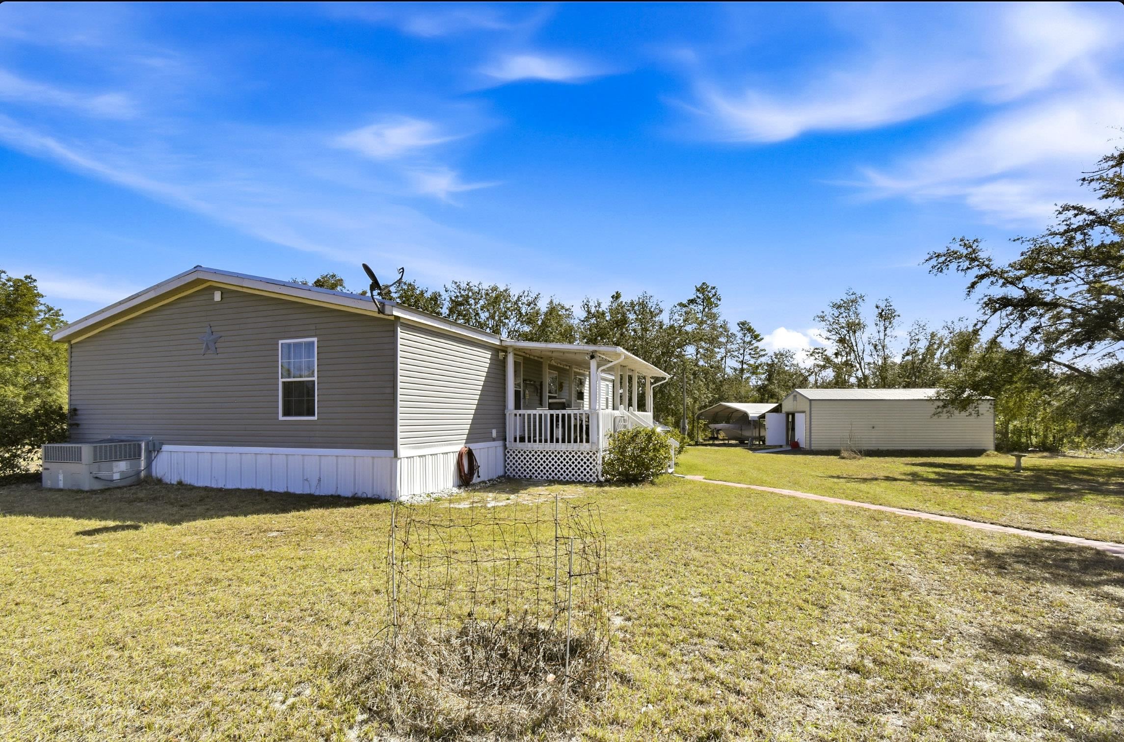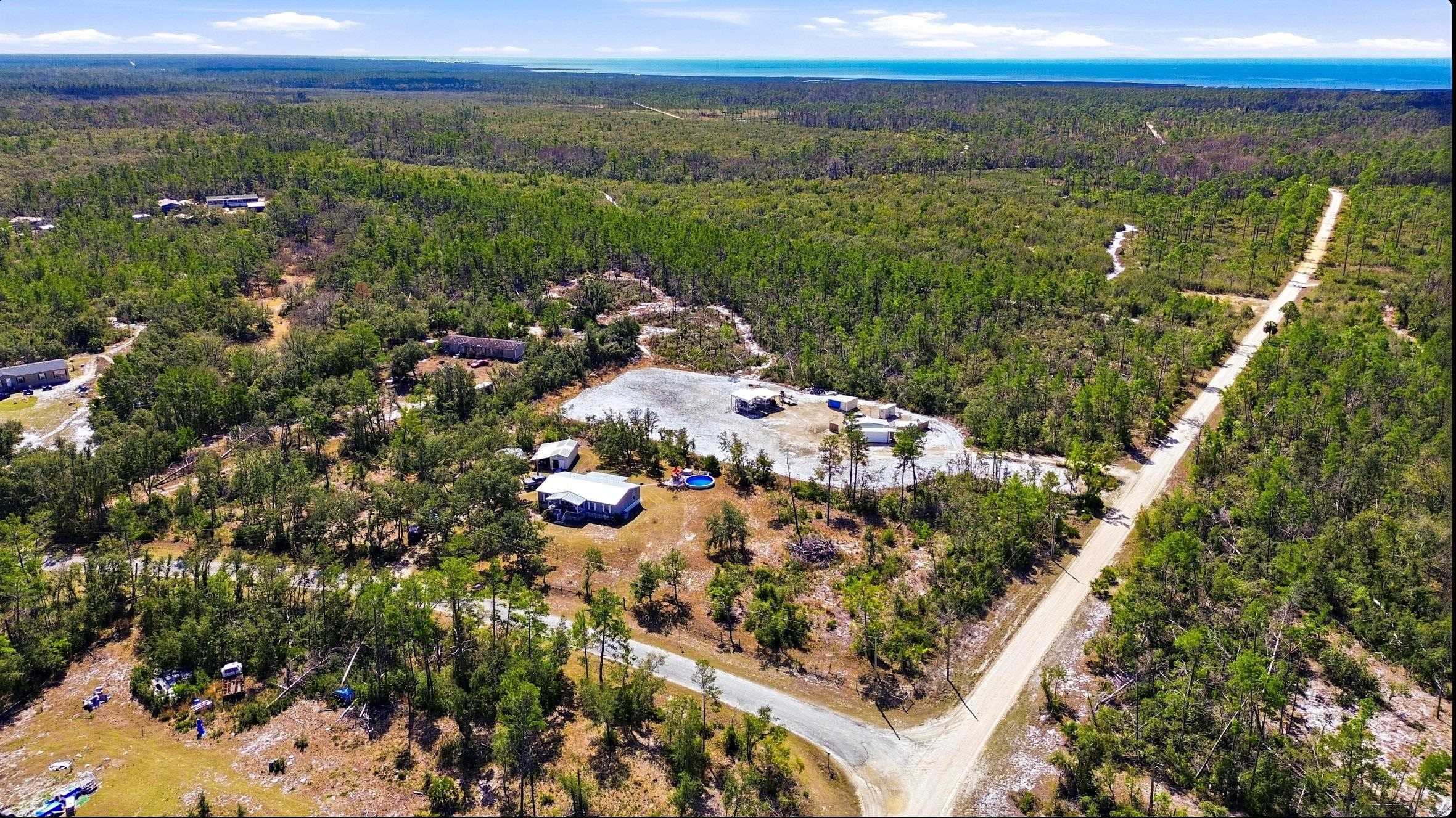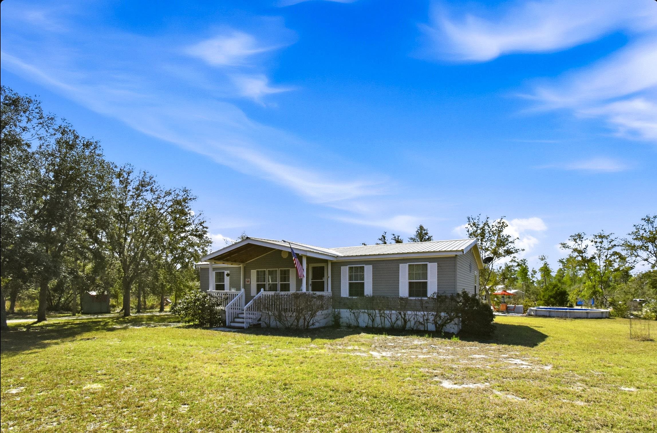 Welcome home to this 4 bedroom, 2 bath split floor plan. The Master is on one side with a soaking tub, double sinks, walk in shower and a walk in closet. There is an oversized shed with electric. Perfect for your ATV or golf cart. Plenty of room for your projects or hobbies. Fish cleaning station on the rear with water. An outdoor oasis awaits you including a pool, relaxing hot tub and paver patio perfect for table and chairs. This home comes partially furnished and would make a fabulous Airbnb or a laid back winter home, no shoveling snow here! Enter through the mud room including washer and dryer plus a water softener. The kitchen has a large expansive island that can serve as the perfect breakfast spot. There are 2 acres of fenced property with remote control gates. Located adjacent to the Wildlife Management Area, take a walk, ride your bike or use the ATV to explore the area. Sip some sweet tea on the fully covered back porch and bird watch, it's amazing. Or rock on the front porch and star gaze. The Gulf is only 5 minutes away. Be on the water in minutes.
