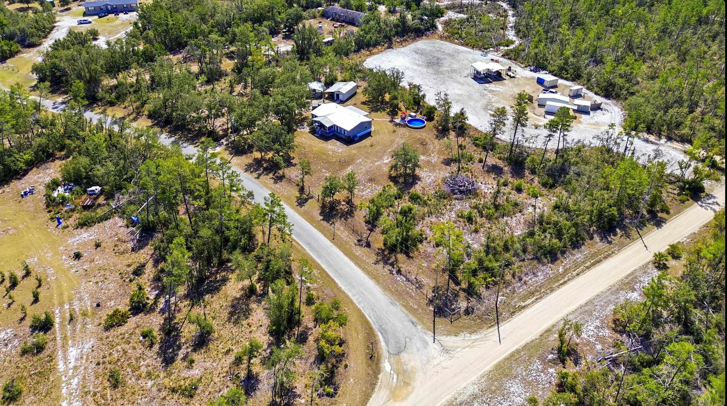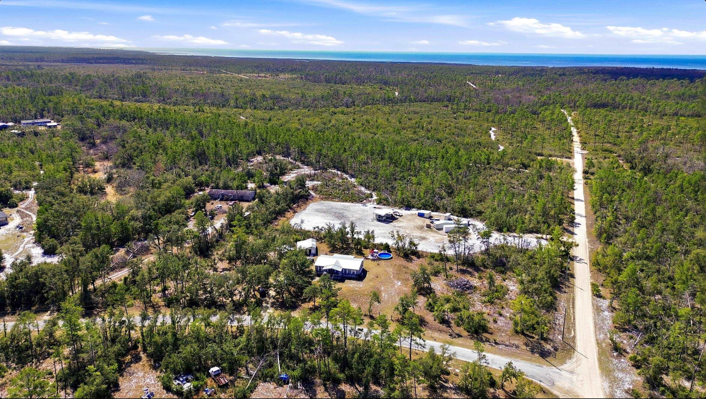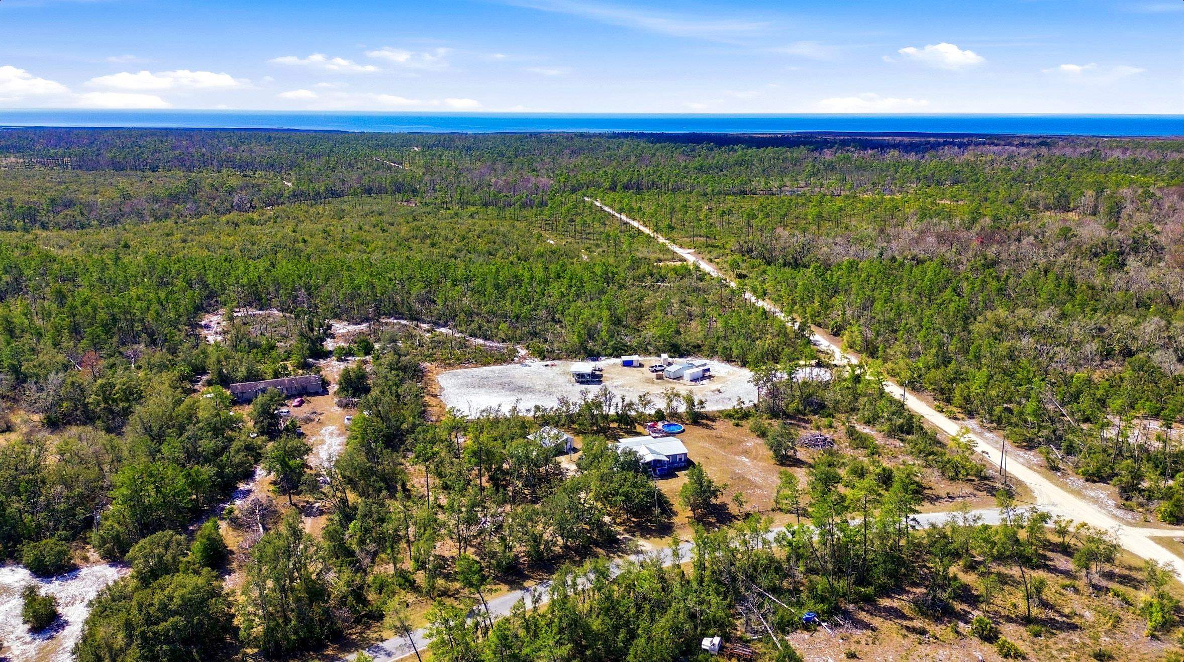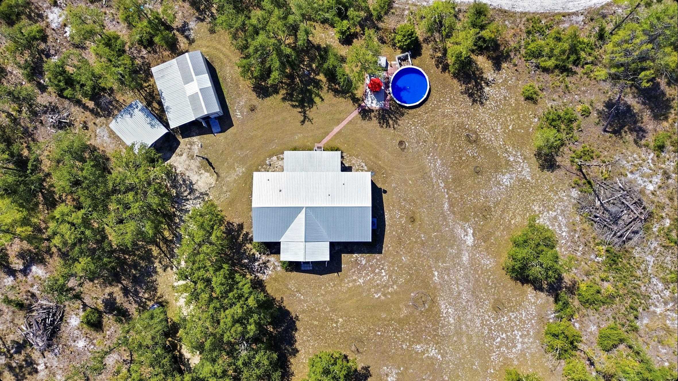 Welcome home to this 4 bedroom, 2 bath split floor plan. The Master is on one side with a soaking tub, double sinks, walk in shower and a walk in closet. There is an oversized shed with electric. Perfect for your ATV or golf cart. Plenty of room for your projects or hobbies. Fish cleaning station on the rear with water. An outdoor oasis awaits you including a pool, relaxing hot tub and paver patio perfect for table and chairs. This home comes partially furnished and would make a fabulous Airbnb or a laid back winter home, no shoveling snow here! Enter through the mud room including washer and dryer plus a water softener. The kitchen has a large expansive island that can serve as the perfect breakfast spot. There are 2 acres of fenced property with remote control gates. Located adjacent to the Wildlife Management Area, take a walk, ride your bike or use the ATV to explore the area. Sip some sweet tea on the fully covered back porch and bird watch, it's amazing. Or rock on the front porch and star gaze. The Gulf is only 5 minutes away. Be on the water in minutes.