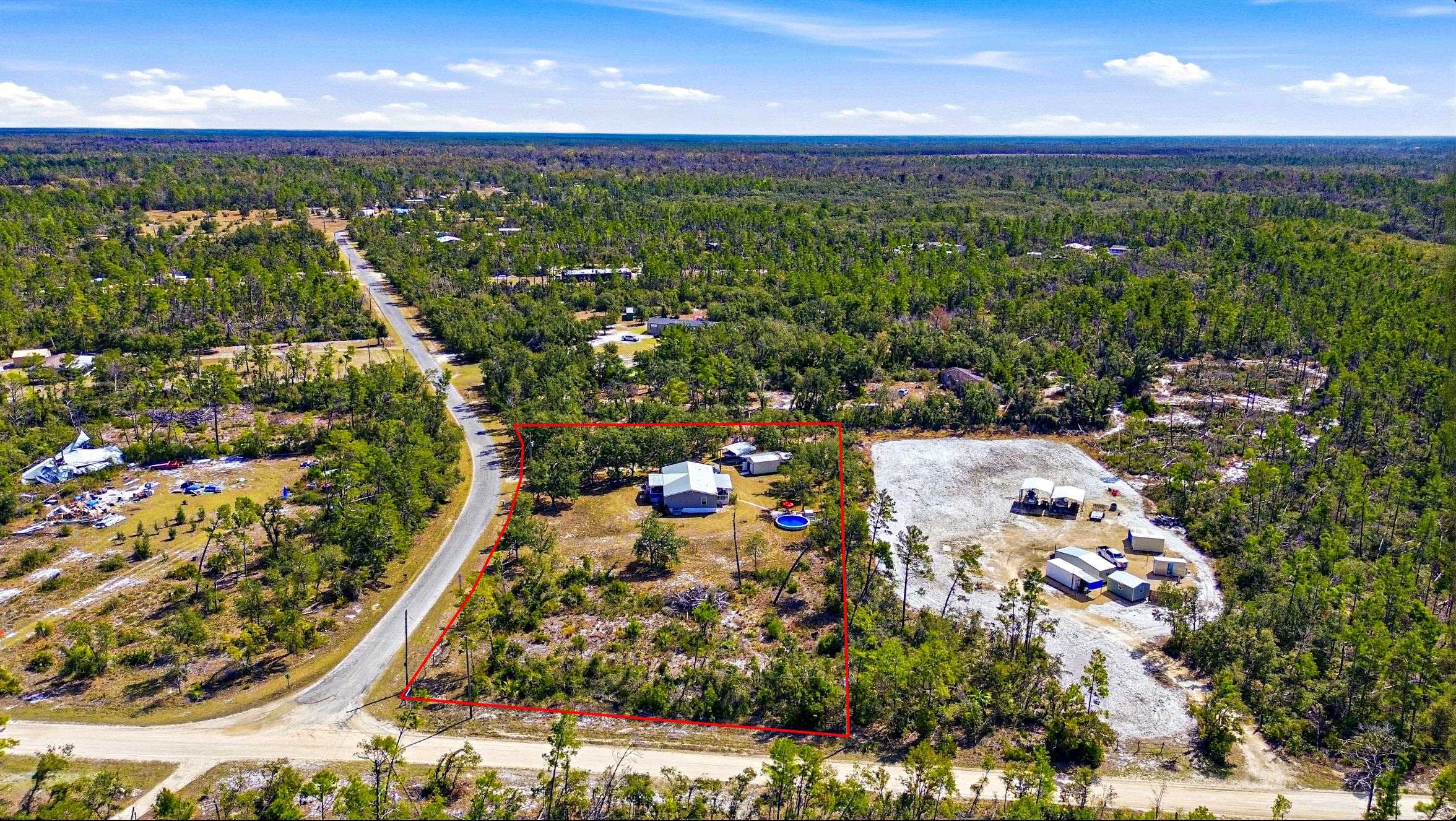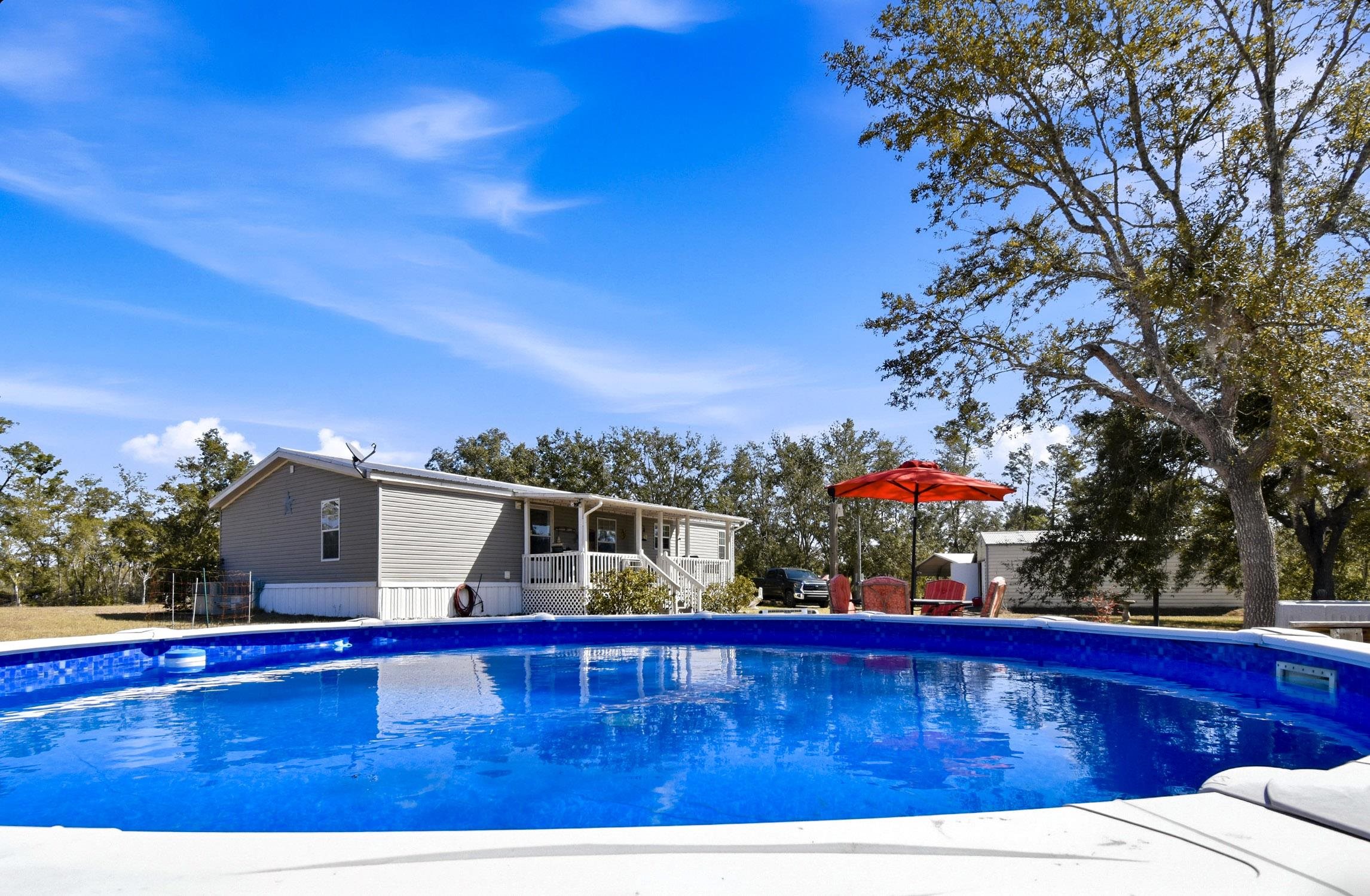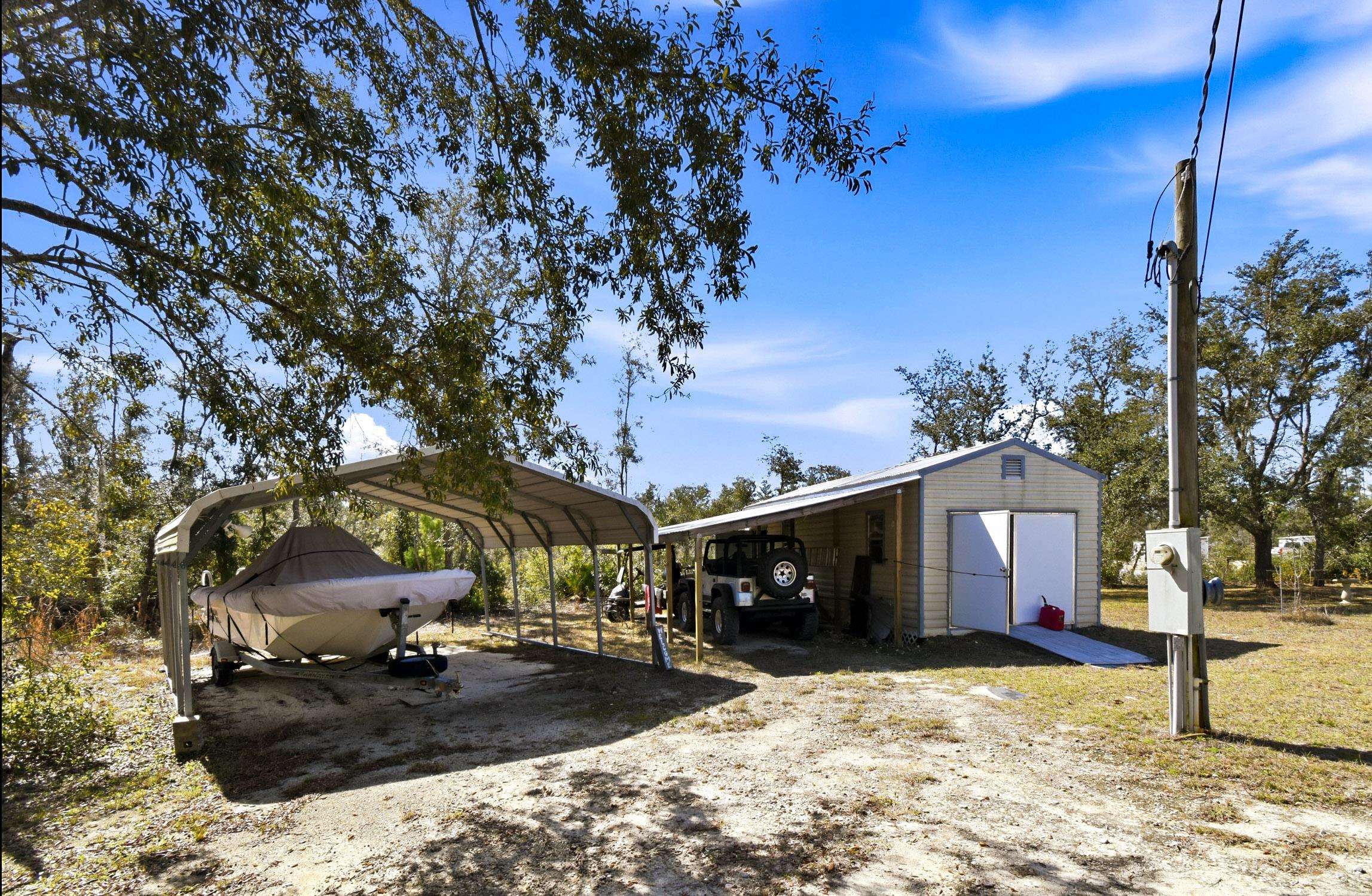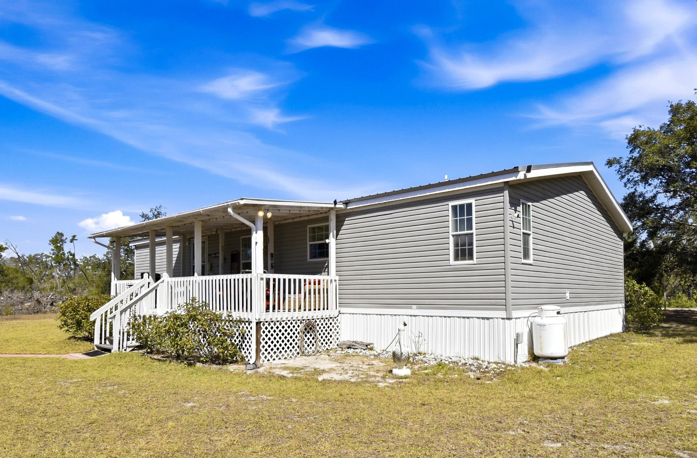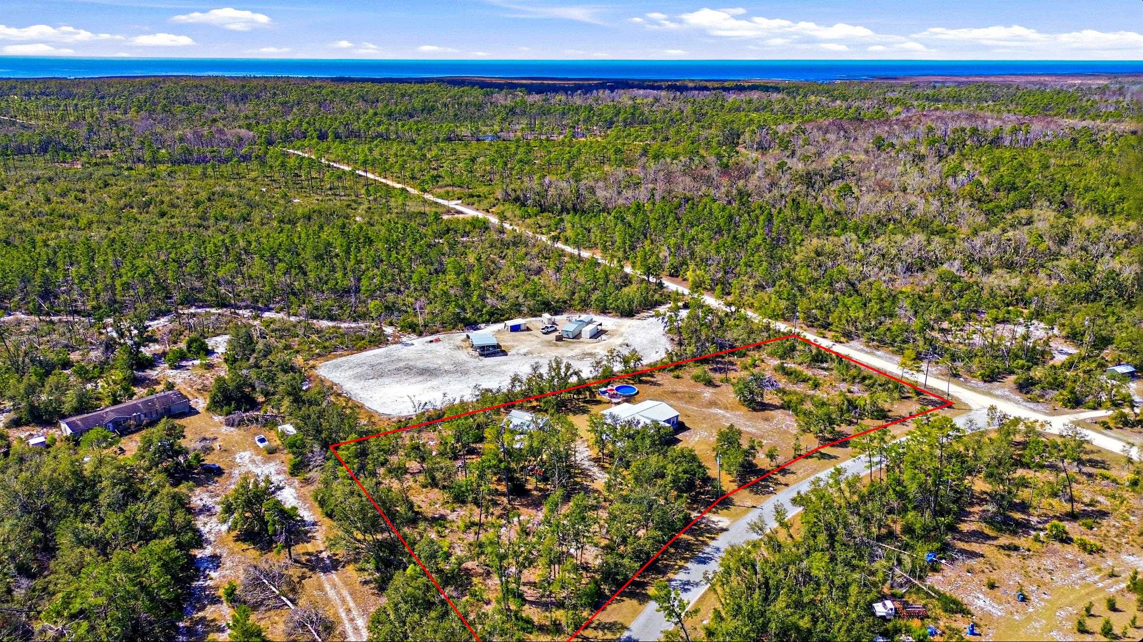 Welcome home to this 4 bedroom, 2 bath split floor plan. The Master is on one side with a soaking tub, double sinks, walk in shower and a walk in closet. There is an oversized shed with electric. Perfect for your ATV or golf cart. Plenty of room for your projects or hobbies. Fish cleaning station on the rear with water. An outdoor oasis awaits you including a pool, relaxing hot tub and paver patio perfect for table and chairs. This home comes partially furnished and would make a fabulous Airbnb or a laid back winter home, no shoveling snow here! Enter through the mud room including washer and dryer plus a water softener. The kitchen has a large expansive island that can serve as the perfect breakfast spot. There are 2 acres of fenced property with remote control gates. Located adjacent to the Wildlife Management Area, take a walk, ride your bike or use the ATV to explore the area. Sip some sweet tea on the fully covered back porch and bird watch, it's amazing. Or rock on the front porch and star gaze. The Gulf is only 5 minutes away. Be on the water in minutes.